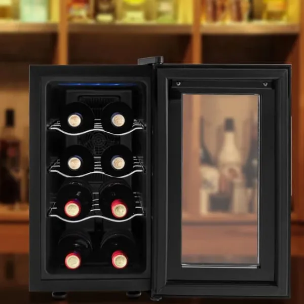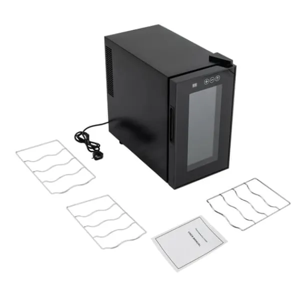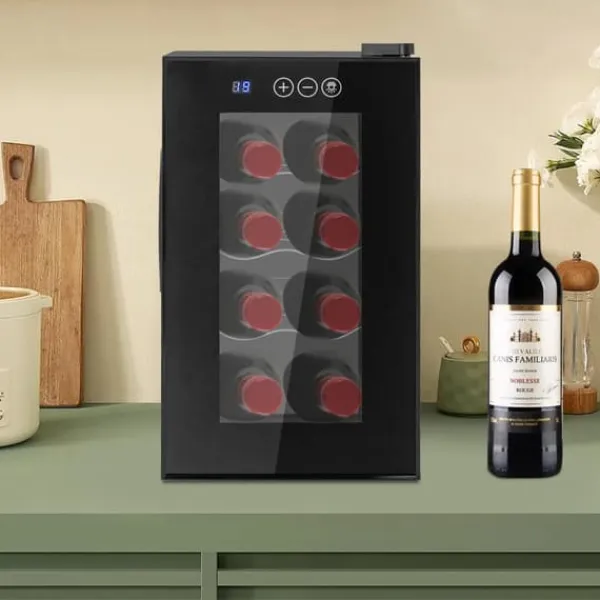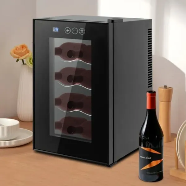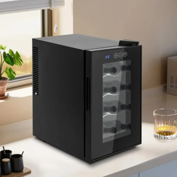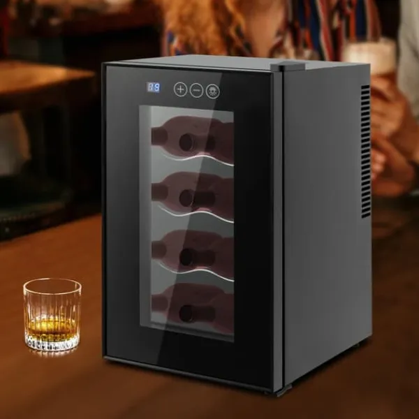 Kompakt 23 L vinkøler til 8 flaskerDenne fritstående, sorte vinkøler med LED‑display holder en præcis temperatur på 8–18°C og rummer op til 8 flasker. Halvlederkøling, lavt lydniveau og udtagelige hylder gør den ideel til hjem, kontor, hotel, bar og klub – perfekt til både røde, hvide og søde vine.