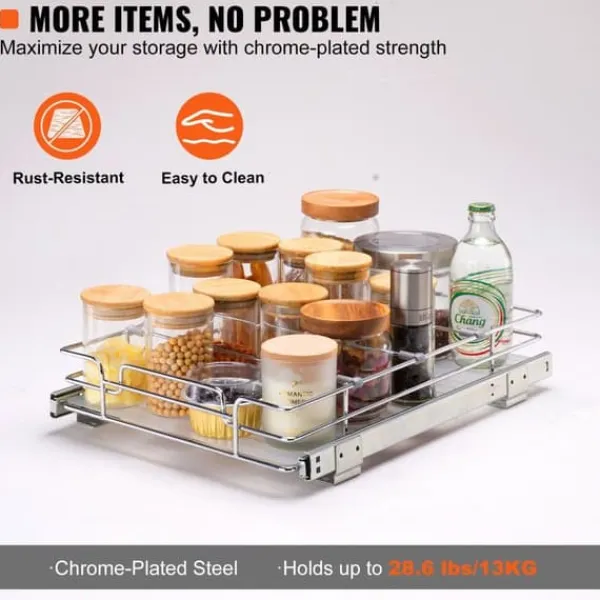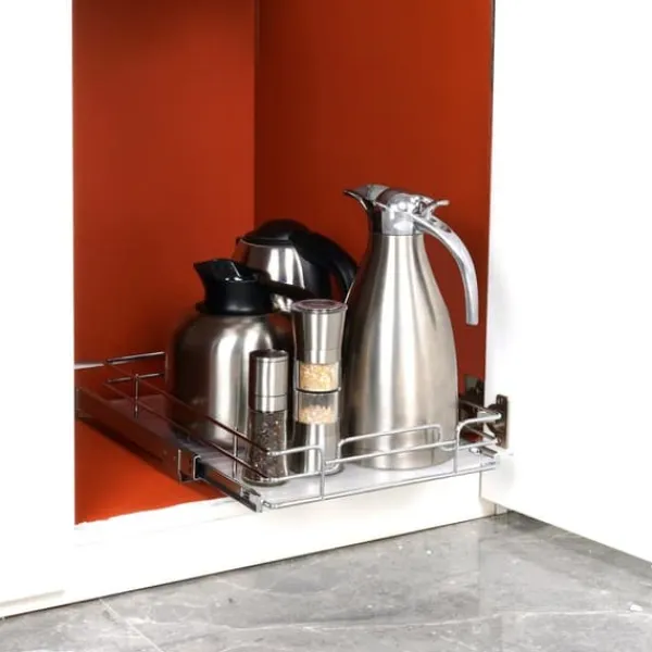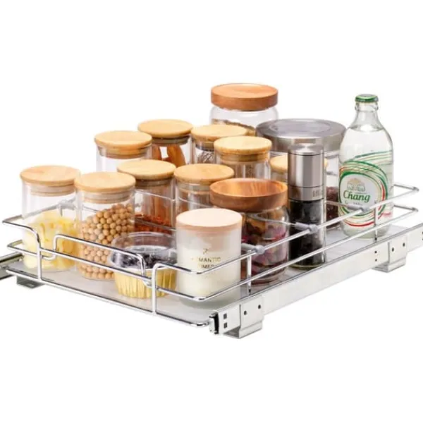 Vores udtrækkelige skabshylde skaber ekstra opbevaringsplads i et lille skab og kan bruges i ethvert skab. Du kan opbevare gryder og pander, krydderiglas, fødevarebeholdere, rengøringsmidler, krydderihylder og andre genstande, hvilket sparer dig for meget plads.