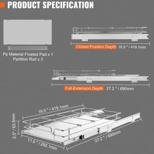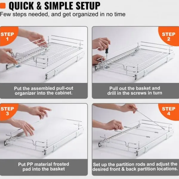 Vores underskabsregal kan installeres i 4 enkle trin, hvilket sparer tid. Den kan installeres på venstre eller højre side, hvilket gør den velegnet til skabe og effektivt undgår vandrør. Når den først er installeret i bunden af skabet, kan organisatoren nemt trækkes ud, hvilket gør den meget praktisk og bekvem.