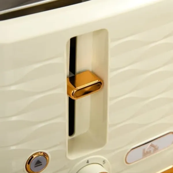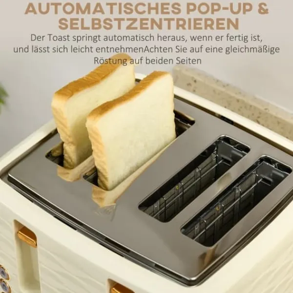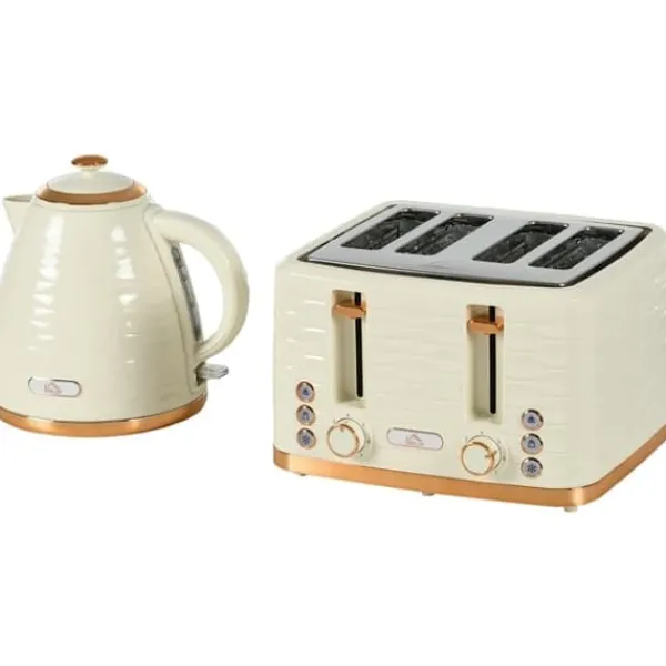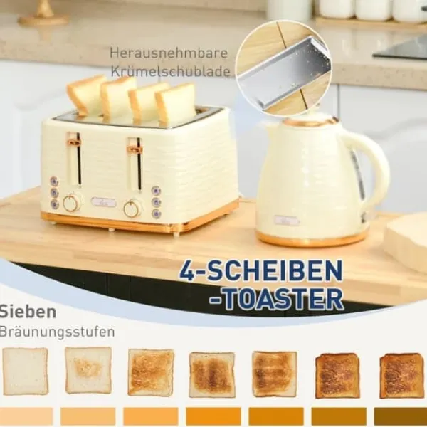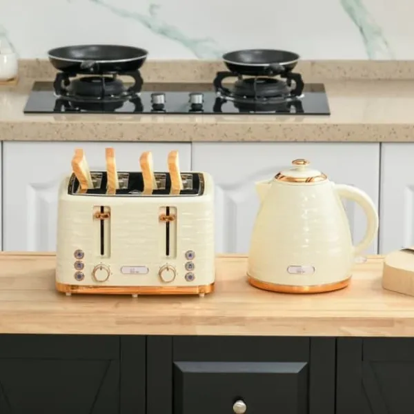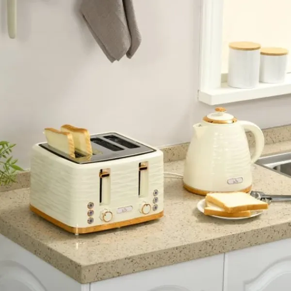 Elegant 2-i-1 morgenmadssæt: Brødrister til fire skiver og kedel i et matchende, riflet design med kromdetaljer – løfter køkkenbordet og forenkler morgenrutinen.