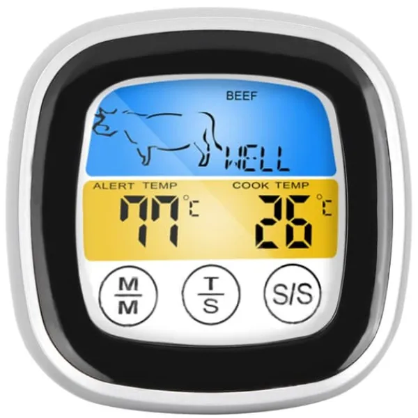 Velkommen til vores butik! Dette sondetermometer er designet til at dyppe eller stikke i genstande for præcist at måle den indre temperatur af mad. Det har et LED-display og en temperaturtabel, der giver dig mulighed for at overvåge temperaturen på kød, ovne og grill på afstand for at sikre perfekt smag. Du kan nemt skifte mellem ℃ og °F-visning for at imødekomme forskellige aflæsningspræferencer. Ideelt til husholdningsbrug, køleskabsopvarmning og fødevareforarbejdningsindustrien. Dette termometer har et bagdæksel med en beslag og magnet for nem fastgørelse til jernmøbler, så du frigør dine hænder under brug. Nøglespecifikationerne inkluderer et måleområde på -20-300 °C, en temperaturopløsning på 1 °C, en temperaturfejl på ±1 °C, en timer på 99:59, og det bruger 2 x AAA-batterier (medfølger ikke). Produktet er lavet af rustfrit stål og ABS med dimensioner på ca. 75 x 75 x 25 mm (2,95 x 2,95 x 1 tomme) og en vægt på ca. 120 g (4,2 oz). Dit køb inkluderer 1 fødevaretermometer, 1 brugsanvisning og 1 sensor. Tilfredshed: Vores kunder er vores højeste prioritet. Hvis du oplever problemer med produktet efter at have modtaget varerne, såsom skader eller forkert mængde varer, bedes du straks kontakte sælgeren. Vi gør vores bedste for at give dig tilfredsstillende eftersalgsservice.