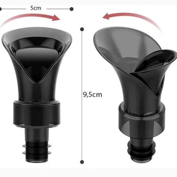 Produktspecifikationer Materiale: plast, gummi. Passer til flaskehalse/vinpropper med en diameter på 20–24 mm. Funktion: hældetud og prop i ét (drej 180° for at lukke). Mål: 9,5 × 5 cm. Farve: sort. I pakken: 1 stk. 2‑i‑1 hældetud.