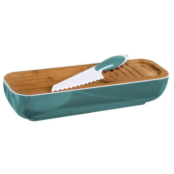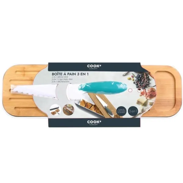 Takket være det,måltidstilberedning vil være hurtigere og mere effektivog dit køkken bliver mereorganiseret.Brødspanden med påskriften er ikke kunpraktisk løsningmen også en smuk tilføjelse til dit køkken.Bestyrelsen, der også fungerer som låg, er lavet afbambus, hvilket garantererholdbarhed og elegance. Det særligekniv gør det lettere at skære og hakke mad.