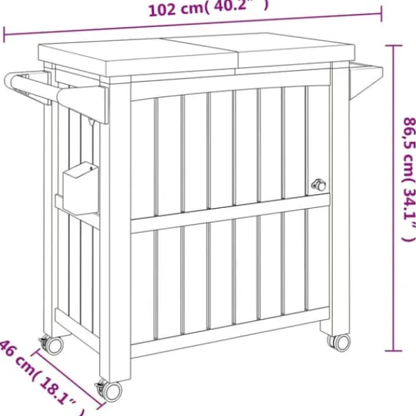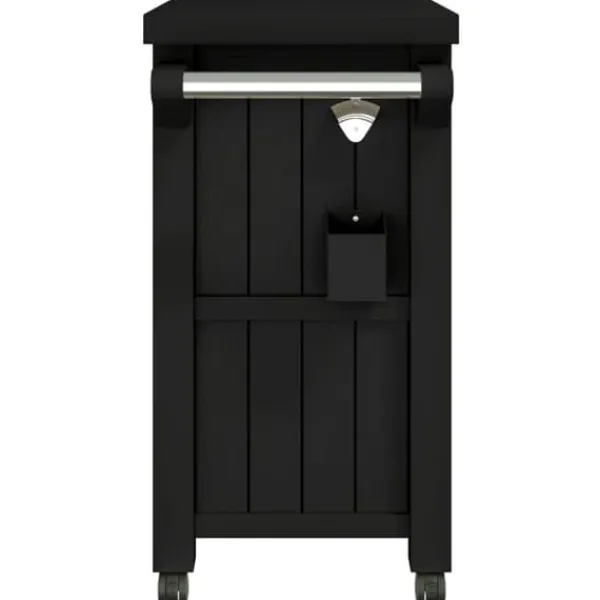 - Praktisk design: Serveringsvognen er forsynet med låg i toppen, der nemt kan åbnes, samt et krydderistativ for nem adgang til drikkevarer og krydderier. Den indbyggede flaskeåbner i siden af køleboksen gør det lettere at åbne drikkevarer. Rummet i bunden tilbyder ekstra opbevaringsplads til drinks, tallerkener, redskaber, køkkenrulle mv.