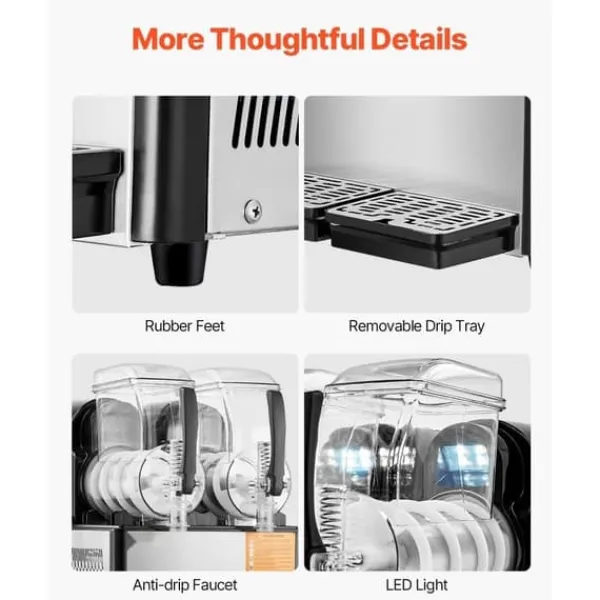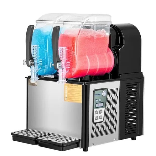 – Stor Kapacitet: Udstyret med to 4L tanke, hvilket giver dig mulighed for at producere op til 32 kopper slushy drinks pr. batch. Perfekt til isbutikker, cafeer, og barer.