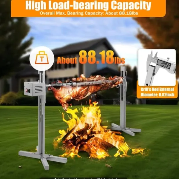Den maksimale bæreevne på cirka 40 kg og en spyddiameter på 20,93 mm giver plads til større udskæringer. US/EU-stik og 110/220V kompatibilitet gør brugen problemfri på tværs af miljøer.