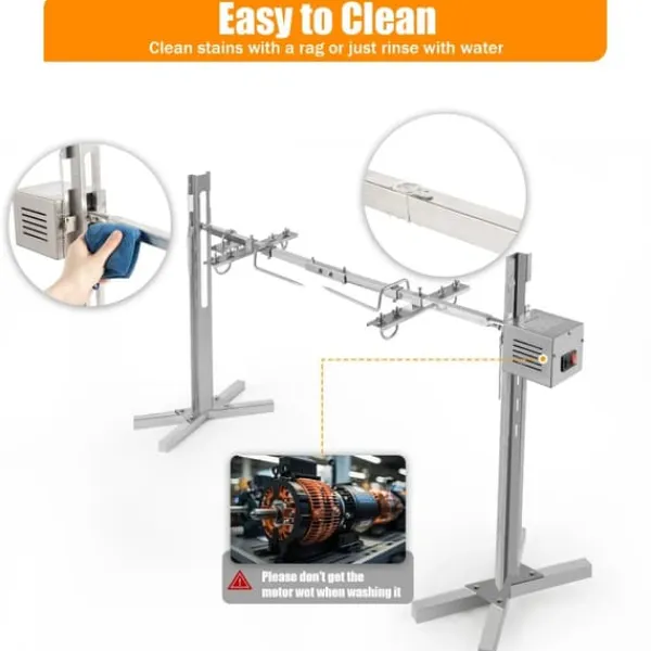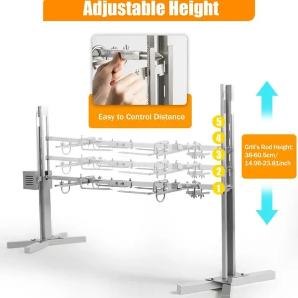 Med højdejustering af spiddet fra 38 til 60,5 cm kan du nemt tilpasse afstanden til varmekilden. Konstruktionen i rustfrit stål med poleret finish er robust, nem at rengøre og bygget til lang holdbarhed.