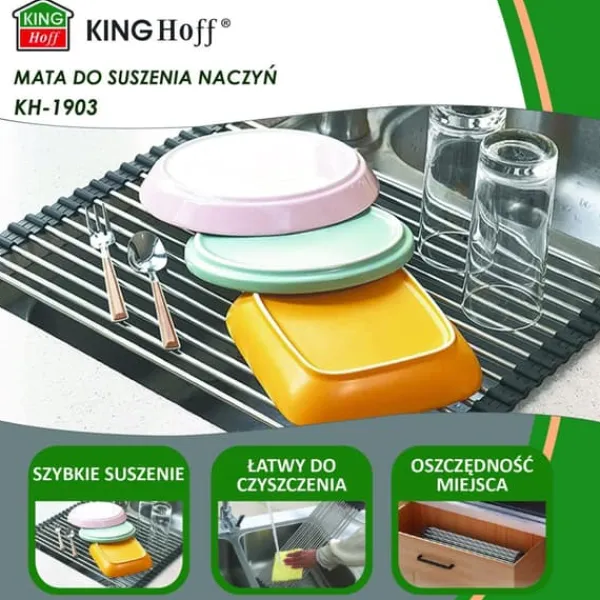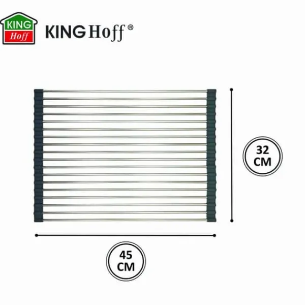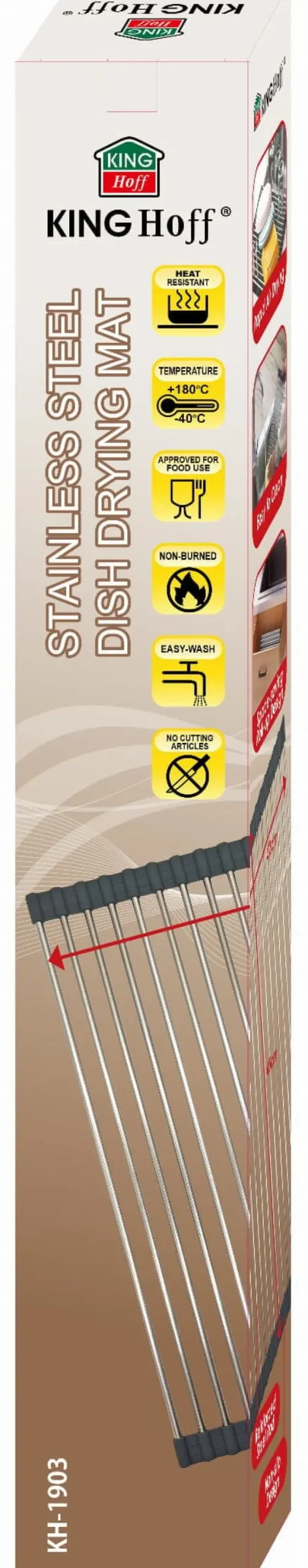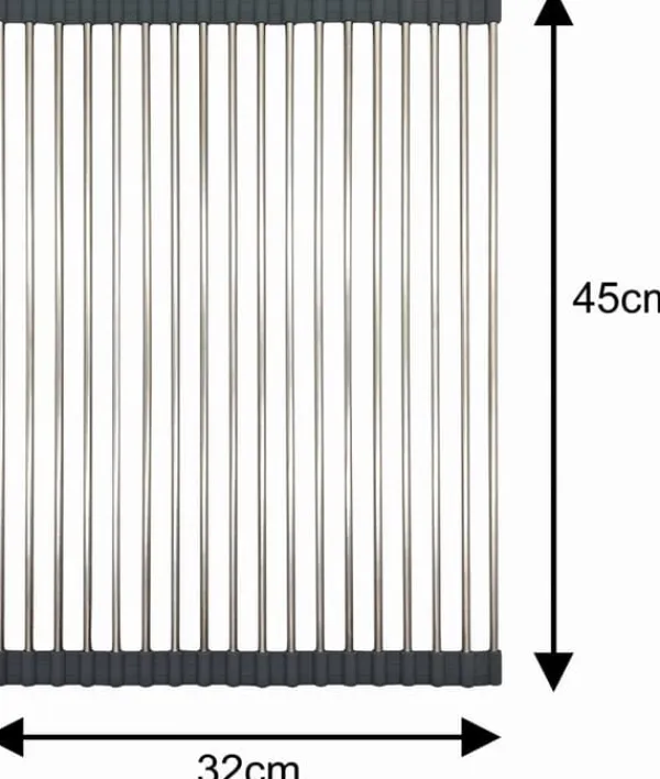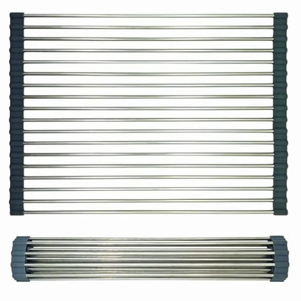 Universal stålafløb til vasken.Silikonekanter giver mulighed forrullendeog om nødvendigt trimning af afløbsrøret til den ønskede bredde. Det giver dig mulighed for at tørre vasket frugt eller grøntsager. Den fungerer også godt som afløb til opvasket service eller bestik.Når den er rullet sammen, fylder den lidtog kan opbevares i en skuffe.