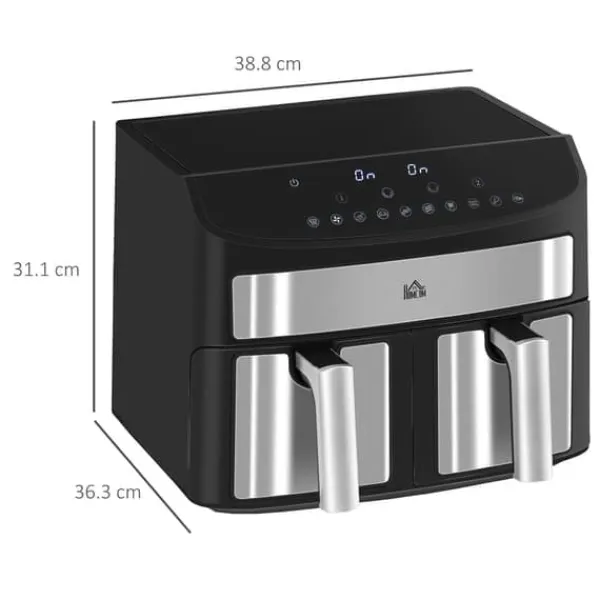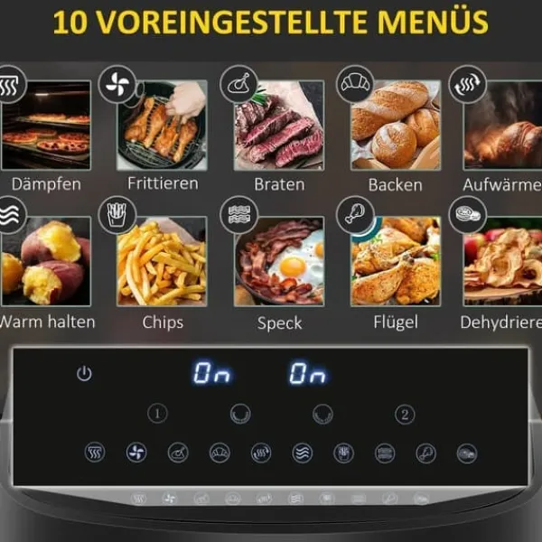 – Forudindstillede menuer: 10 forudindstillinger – Airfry, bagning, Airbroil, stegning, dræning, opvarmning, varmholdning, pommes frites, bacon og vinger. Et udvalg af forudindstillede menuer gør det nemmere at tilberede bestemte fødevarer – tryk blot på touchskærmen og kom i gang