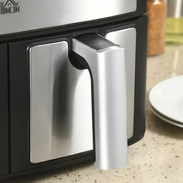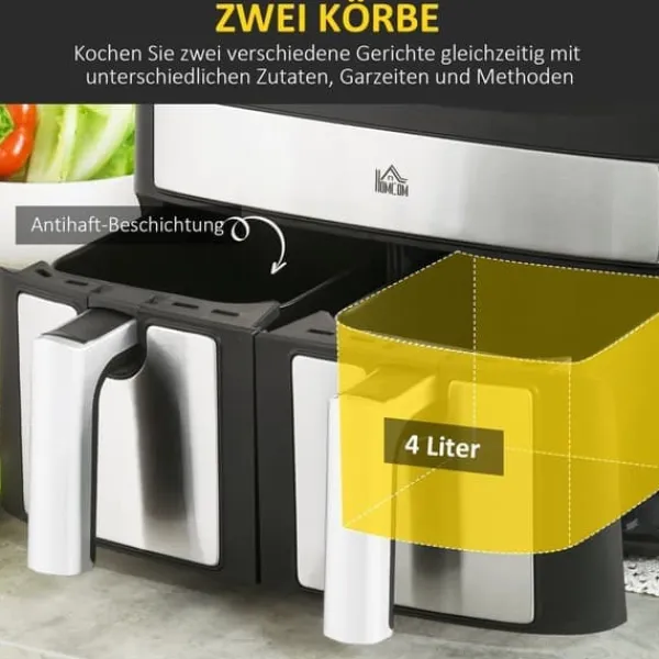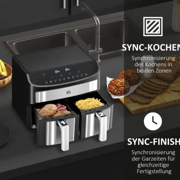 – To 4-liters non-stick kurve: Denne dobbelte varmluftfrituregryde er perfekt til individuel madlavning eller madlavning til familien. Brug kurvene hver for sig eller sammen, afhængigt af hvad du vil lave. Derudover kan indstillingerne for zone 2 synkroniseres med zone 1, så du kan tilberede mere af den samme ret eller forskellige retter med samme funktion, temperatur og tid.