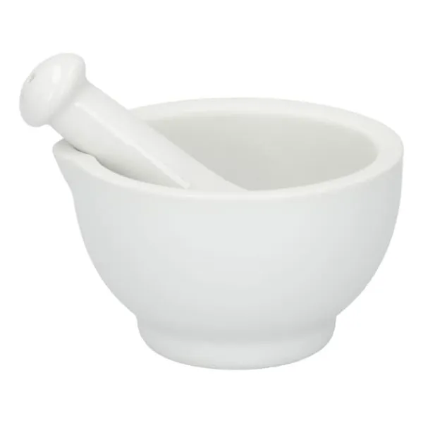 En morter med en inkluderet støder til at støde forskellige urter og krydderier med. Morteren har en hældetud så man let kan hæde det ud, som stødes.