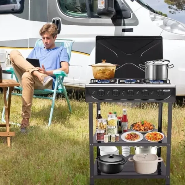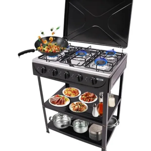 Fritstående gaskomfur med 5 blusser – kompakt kraft i sortDenne rektangulære gaskomfur i sort kombinerer jern, emalje og aluminium for høj holdbarhed og nem rengøring. Med 5 blusser, manuel tænding og naturgas som brændsel får du effektiv varmefordeling og fleksibel placering uden indbygning.