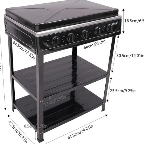 Gennemtænkt afsætningspladsAfsætningspladerne måler ca. 61,5 × 42,5 cm med afstande på ca. 30,5 cm og 25 cm, så du kan organisere gryder og krydderier (ikke inkluderet).
