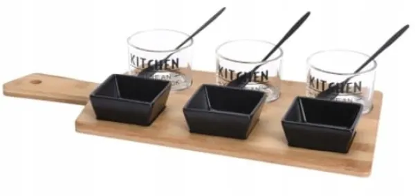Snacksættet fra EXCELLENT HOUSEWARE er ideelt til forretter og snacks. Passer til ethvert køkken. Uerstatteligt ved fester . Det er perfekt til at placere forretter på det – både varme og kolde. Sættet indeholder et bambusbræt og 6 skåle – 3 gennemsigtige med 3 skeer og 3 keramik. Skålene er nyttige til servering af saucer, dips og små snacks. Dette er en god gaveidé!