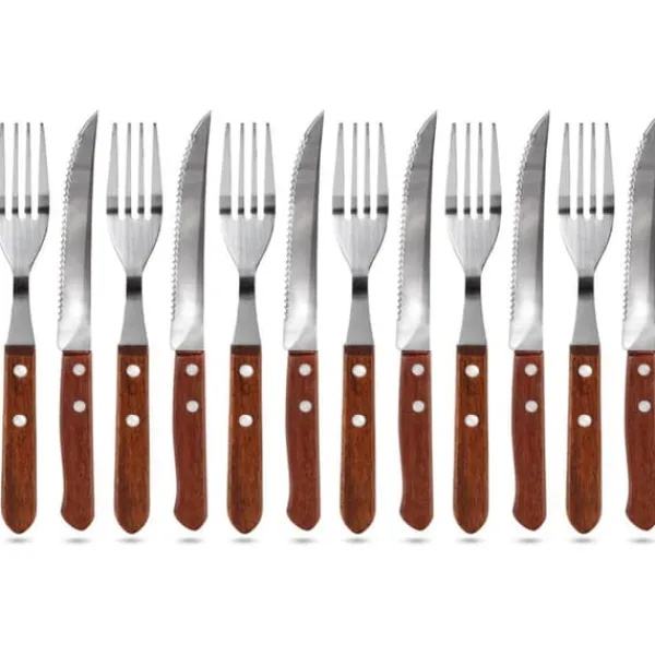 Bøfbestiksæt Materiale: rustfrit stål, træ Detaljer: – Bøf- og pizzabestiksæt (12 stk.), inklusive en kniv med takkede tænder (6 stk.) og en gaffel (6 stk.). – Solide håndtag med 2-punkts nitning af stål. – Pakket i en elegant blisterpakning – Det anbefales ikke at vaske i opvaskemaskinen Mål på knive total længde: 20,5 cm bladlængde: 11 cm skaftlængde: 9,5 cm håndtagstykkelse: 1,0 cm Mål på gafler gaffellængde: 18,5 cm længde håndtag: 9,5 cm gaffelbredde: 2,5 cm håndtagstykkelse: 1,0 cm