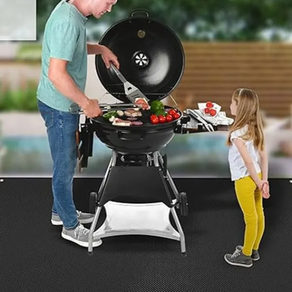 Varmebestandig og brandsikker: Denne grillmåtte er lavet af højkvalitets og varmebestandige materialer, som kan modstå temperaturer op til 500°F. Dette sikrer, at din terrasse, dæk eller græs forbliver beskyttet mod skader forårsaget af gløder, fedt og spild.