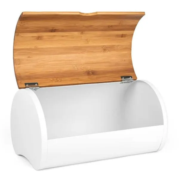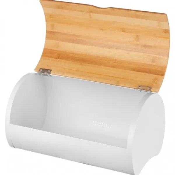 Brødspandens moderne form, dens attraktive form og kombinationen af hvidt metal og bambus ser godt ud på bordpladen. Metalhuset er pulverlakeret for større holdbarhed og korrosionsbestandighed. Sættet indeholder 3 beholdere til kaffe, te og sukker. Specifikation: Krop lavet af malet rustfrit stål i mat hvid. Let trælåg Let at åbne. Sparer plads. Designet til opbevaring af alle typer brød. Attraktivt, moderne design. Lavet af økologiske materialer. Emballage: farvet pap. Farve: mat hvid/lys træ. Mål på brødbeholderen: Længde: 38 cm Bredde: 27 cm Højde: 19 cm Beholdermål: Diameter: 10 cm Højde: 10 cm