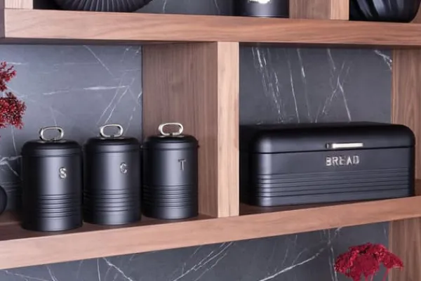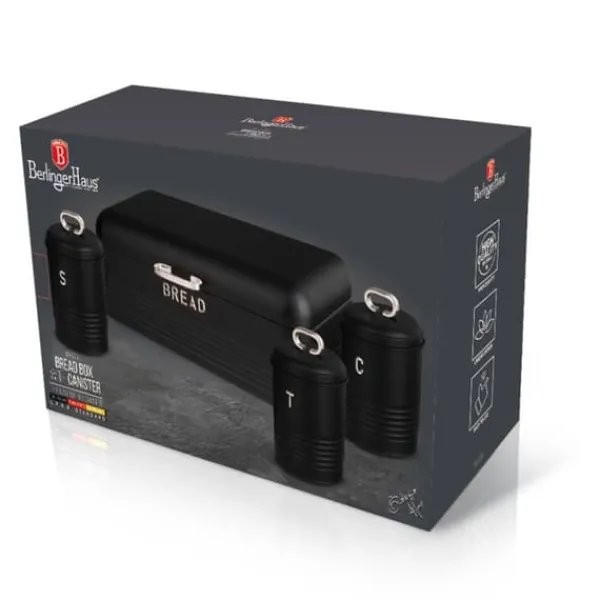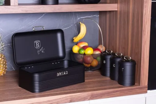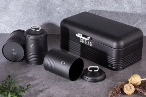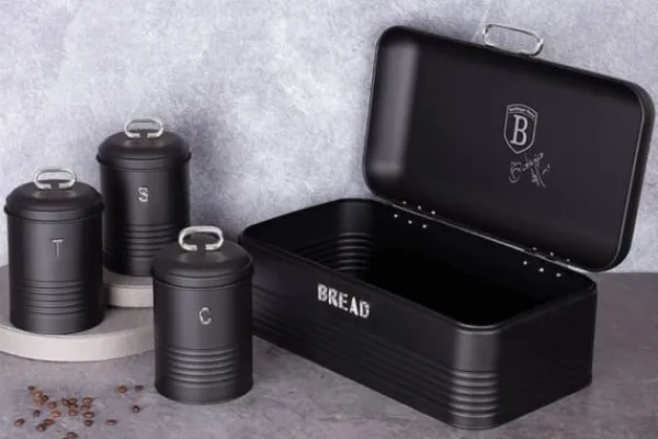 Elegant brødspand fra Berlinger Haus fra Black Silver Edition-linjen med et sæt køkkenbeholdere. Det ser ekstremt stilfuldt ud i ethvert køkken. Yderligere information: Brødspand af kulstofstål i sort. længde: 42,5 cm / bredde: 23 cm / højde: 16 cm Kulstofstålbeholdere i sort, diameter: 11,5 cm / højde: 15 cm (med håndtag 19 cm) Designet til opbevaring af alle slags brød køkkenindretning. Dens moderne design kombineret med elegante detaljer gør brødspanden til en dekoration til ethvert interiør. Den perfekte løsning til folk, der leder efter et funktionelt og stilfuldt tilbehør til opbevaring af brød og løse produkter som kaffe, te og sukker. Dens holdbare konstruktion og fremragende pladsorganisering sikrer komfort ved daglig brug. Derudover gør det elegante design brødspanden til et attraktivt dekorativt element i køkkenet.