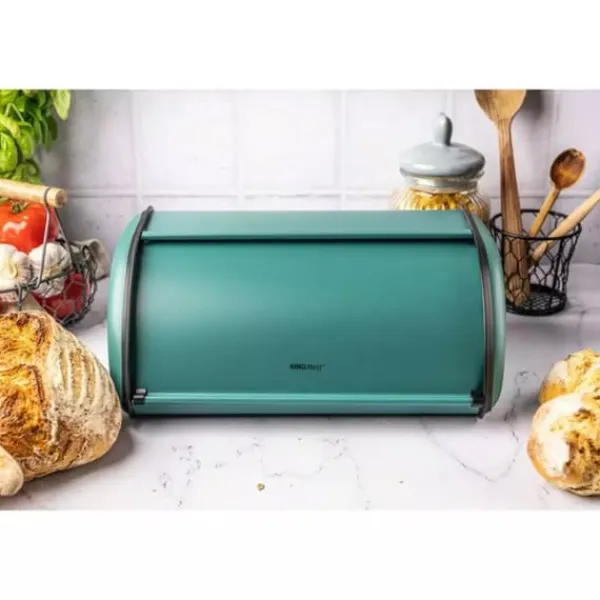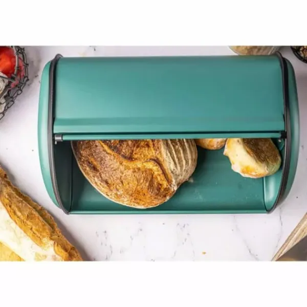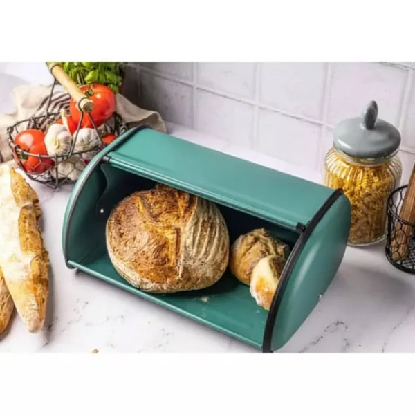 Stor rullebeholder lavet af blålakeret rustfrit stål. Funktioner: Designet til opbevaring af alle typer brød, Let at rengøre, Holdbar og modstandsdygtig over for skader, Låget åbner og lukker blidt, Praktisk åbning giver nem adgang. Mål: Højde: 15 cm, Bredde: 24 cm, Længde: 36 cm Farve: grøn.