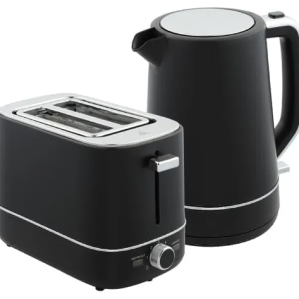 Slankt design: Dette sorte kedel- og brødristersæt imponerer med sin stilfulde overflade og bløde linjer, som løfter køkkenindretningen og tilføjer et moderne touch til dit arbejdsområde.