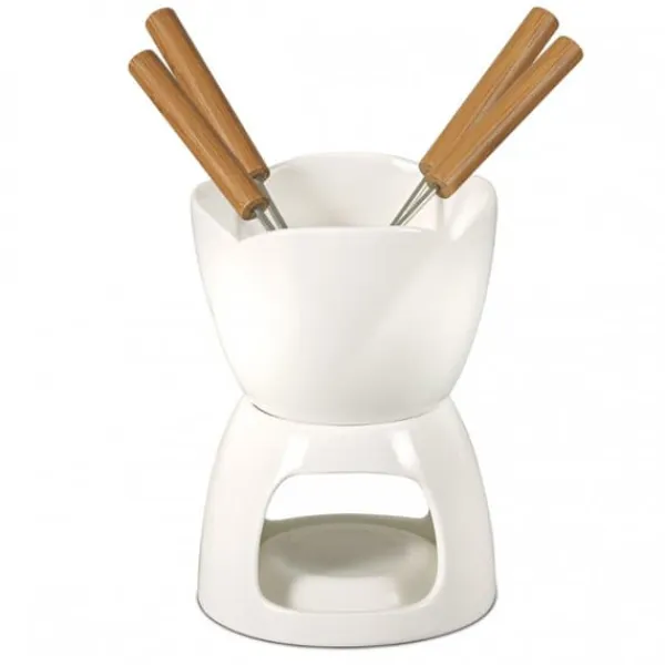 Chokoladefonduesæt til 4 personer. Fondue er en god idé til et samvær under lange aftener. Materiale: keramik, rustfrit stål, 6-delt Fonduesæt COLLEZIONE BIANCA, sæt inkluderer: 1x keramisk skål, diameter 10,5 cm, højde 8 cm, 1x keramisk stativ til stearinlys (diameter 10,5 cm, højde 7,5 cm), 4x rustfri stålgaffel, længde 17,5 cm, med bambusgreb. .