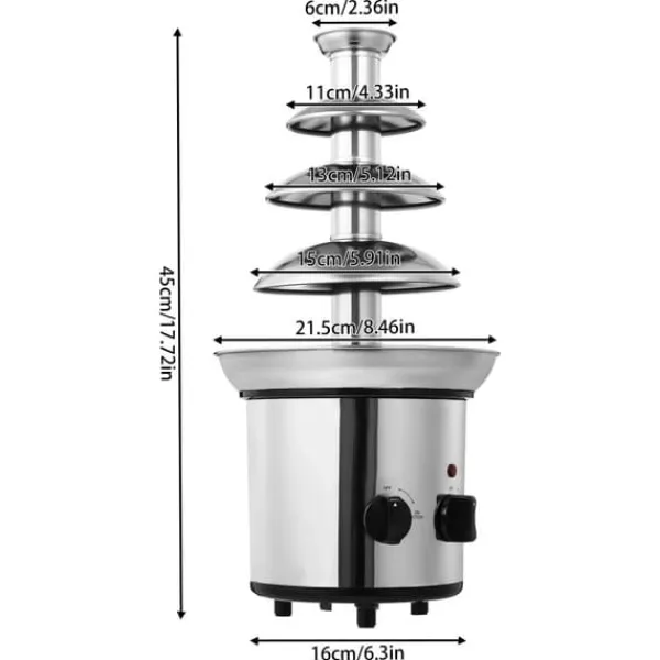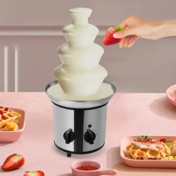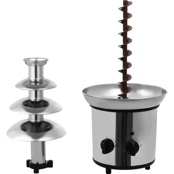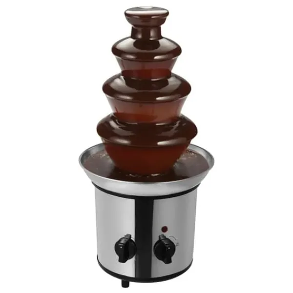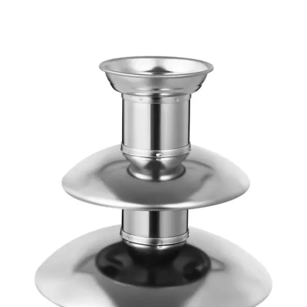 Chokoladefontæne i rustfrit stål med 4 niveauer – ideel til fester og buffeter Forkæl gæsterne med jævnt flydende, lækker chokolade. Denne sølvfarvede fontæne kombinerer robust konstruktion med pålidelig opvarmning og et spiraldesign, der giver en smuk kaskadeeffekt.