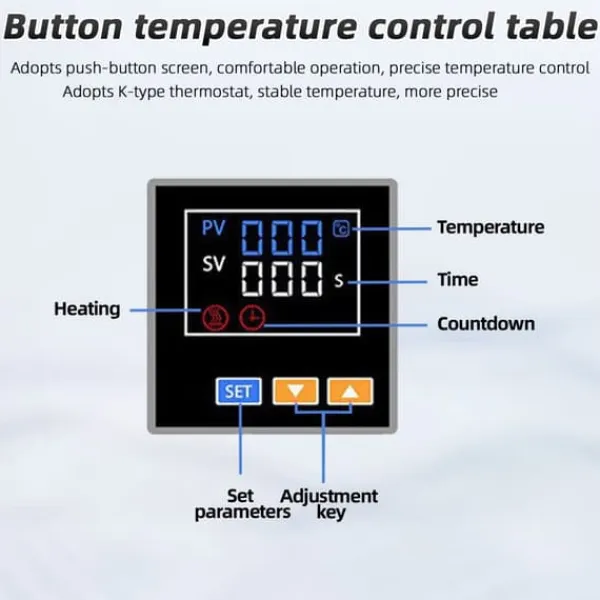 - stabil temperaturkontrol: nyd konsistensen af dobbeltsidet opvarmning med en pålidelig k-type termostat for optimal ydeevne.