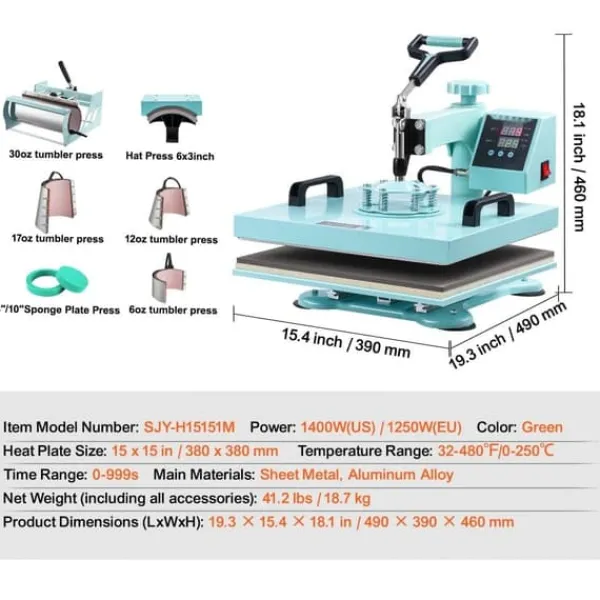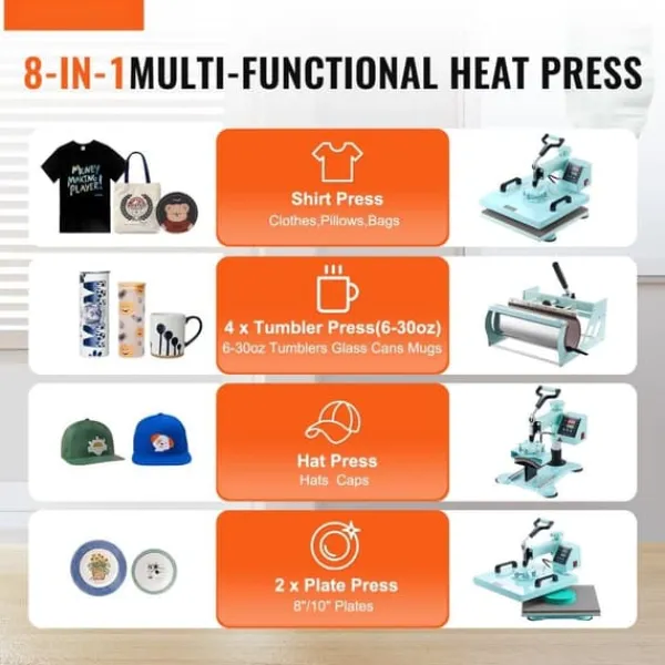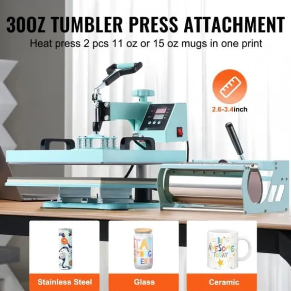 Alsindig varmepresse: Den 8-i-1 multifunktionelle varmepressemaskine leveres med flere tilbehør, så din kreativitet kan udvides uden grænser. Uanset om du vil overføre smukke designs til T-shirts, pudebetræk, hatte, krus eller keramiske plader, gør vores varmepresse det nemt. Den er udstyret med 6 oz/12 oz/17 oz/30 oz tumbler pressetilbehør. Den opgraderede 30 oz store størrelse kan håndtere to krus ad gangen, hvilket i høj grad forbedrer arbejdseffektiviteten!