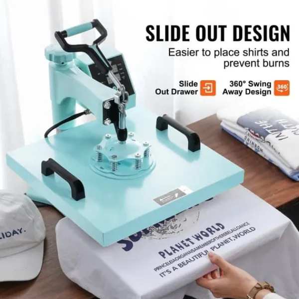 Forbedret sikkerhed mod forbrændinger: Når du placerer eller fjerner T-shirts, kan du bruge den 360° svingbare arm til at flytte varmepladen til siden og trække skuffen ud. Disse sikkerhedsfunktioner holder dig væk fra varmepladen og forhindrer forbrændinger. Udtræksdesignet giver mere plads til nem og komfortabel betjening.