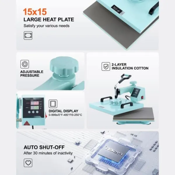 Præcis digital kontrol: Du kan forudindstille temperatur og tid i henhold til forskellige overførselsmaterialer for at opnå tilfredsstillende resultater. Temperaturområde: 32-480 ℉ / 0-250 ℃, tidsinterval: 0-999 s. Du kan skifte mellem °C og °F med knapperne (▲/▼) for at vælge den ønskede temperaturvisningstilstand. Når den forudindstillede temperatur er nået, stopper varmeoverførselsmaskinen automatisk og afgiver en alarm, hvilket forhindrer overophedning.