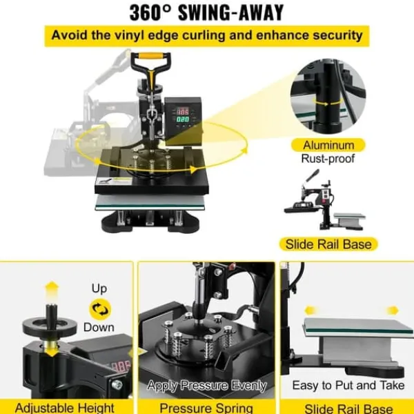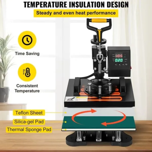 360° svingbar base: Denne maskine kan dreje glat 360 grader og har en fleksibel base, der kan trækkes frem og tilbage. Det skridsikre gummihåndtag sikrer en behagelig brugeroplevelse. Den justerbare kraft sikrer, at pladerne tæt omslutter materialet og opnår en fremragende varmeeffekt.