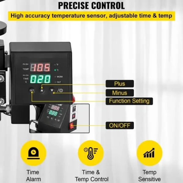 Digitalt kontrolsystem: Denne varmpresse er udstyret med et præcist betjeningspanel, der hjælper dig med at regulere temperaturen og tiden nøjagtigt. Når varmeprocessen er afsluttet, lyder der automatisk en alarm for at minde dig om at tage genstandene ud. Temperaturinterval: 0-250 °C / 32-430 °F; Tidskontrol: 0-999 sekunder; Effekt: 650 W; Spænding: 220 V.
