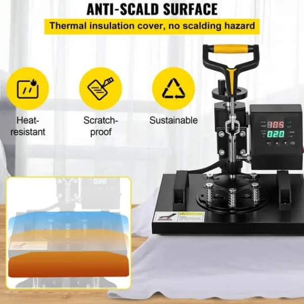 Effektiv isolering: Denne varmpresse med Teflon-belægning er i stand til at reducere risikoen for forbrændinger under overførslerne. Den er nem at rengøre og sikrer en jævnere trykfordeling. En jordledning er også tilgængelig for sikker drift.