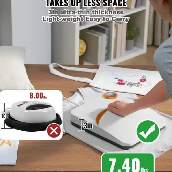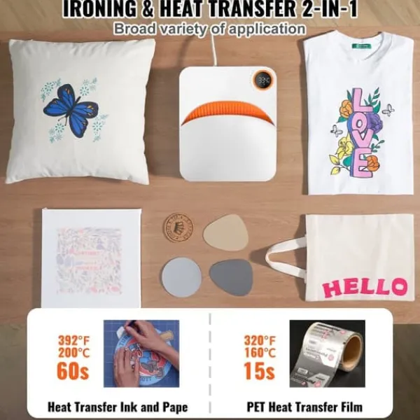 Få mere ud af det: Er du klar til muligheder? Gør dig klar til at få det bedste ud af din varme presse! Denne enhed kan bruges til strygning eller termotransfertryk, hvilket gør den hurtigere og mere jævn i opvarmningen end et almindeligt strygejern. Den er udstyret med en sikkerhedsbasis og en varmeisolerende krop, der beskytter dig hele tiden. Kom nu, tag alle de tøjgenstande, du har ved hånden, og prøv det!