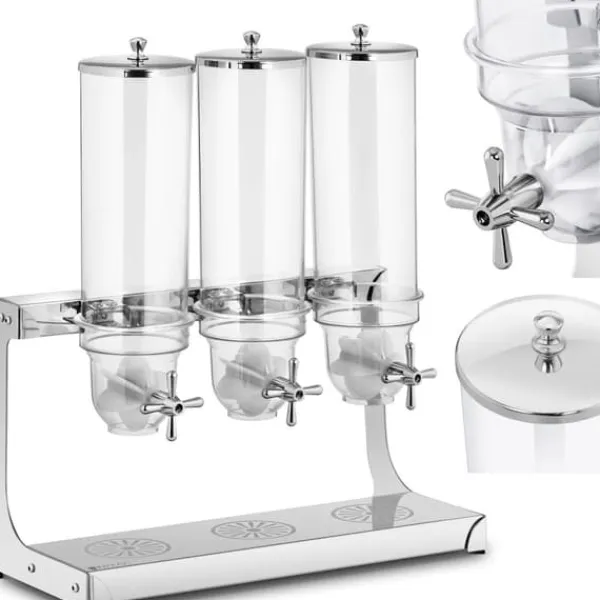 Producentkode: 10011387 Den praktiske Royal Catering korndispenser giver dig mulighed for at opbevare og bekvemt dispensere løse produkter: morgenmadsprodukter, små kiks og kager, slik, nødder, tørret frugt, kaffe. Den kan bruges overalt, hvor der serveres morgenbuffet – på hoteller, restauranter og bistroer. Den gennemsigtige cylinder lavet af plastik rummer 10,5 liter og isolerer produkterne perfekt mod ydre faktorer. Produktegenskaber: – Brugbarhed – til opbevaring og dispensering af løse produkter (op til 10,5 liters kapacitet), – Gennemsigtighed – den gennemsigtige cylinder giver dig mulighed for at se det aktuelle fyldningsniveau for dispenseren, – Økonomi – dispenseren måler den nøjagtige mængde flager , minimerer tab, – Holdbarhed – mad holder sig frisk i lang tid, – Design – stativ i rustfrit stål. Tekniske parametre: – Model – RCCS-3.5LSS3 – Katalognummer – 10011387 – Artikeltilstand – Ny – Basismateriale – Rustfrit stål – Beholdermateriale – Plast – Udløbsmateriale – Silikonegummi – Maksimal højde på det anbragte kar – 13 cm – Kapacitet – 3 x 3,5 l – Mål (LxBxH) – 50 x 26,00 x 65,00 cm – Vægt – 4,95 kg – Forsendelsesmål (LxBxH) – 55,00 x 29,00 x 37,50 cm – Fragtvægt – 5,75 kg Sættet indeholder: – Flake dispenser