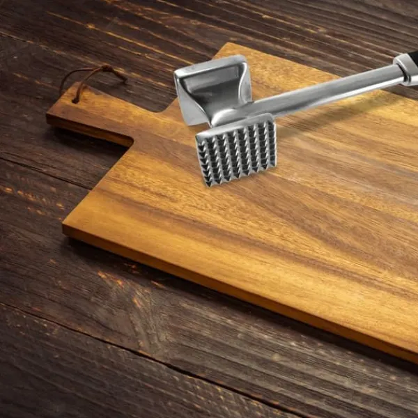 ✅ DOBBELTSIDIGT – Kødhammeren har to bankeflader: glat og nubbet. Den glatte side er ideel til at flade kød ud, hvilket giver mulighed for ensartede, tynde stykker, der steges eller tilberedes jævnt. Den nubbede overflade muliggør derimod grundig bankning og mørning af kødet, hvilket fremmer bedre absorption af krydderier, marinader og smagsstoffer.