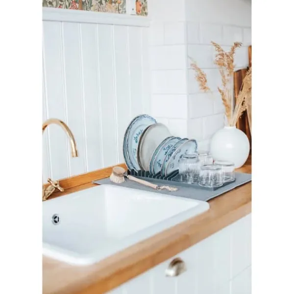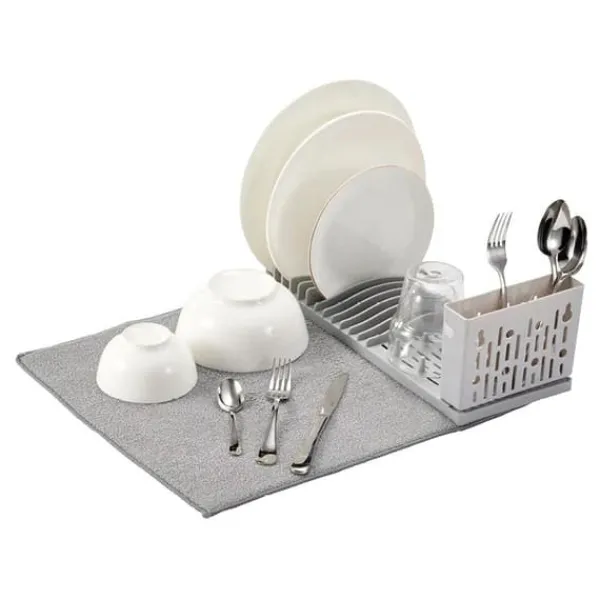 Smidigt, litet och praktiskt diskställ i plast med ställ för tallrikar och bestickkorg underlaget är gjort av microfiberduk som suger upp vatten och torkar fort. Tar liten plats i det lilla köket då man enkelt kan lägga in det i skåpet när det inte används. Passar även bra i husvagnen, båten eller husbilen.