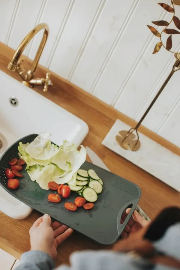 Suvi skärbräda med avrinning och en del med rivning av grönsaker. Underlättar att hälla av vatten i vasken när man skär grönsaker då kanten går upp en liten bit i ena änden.