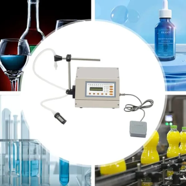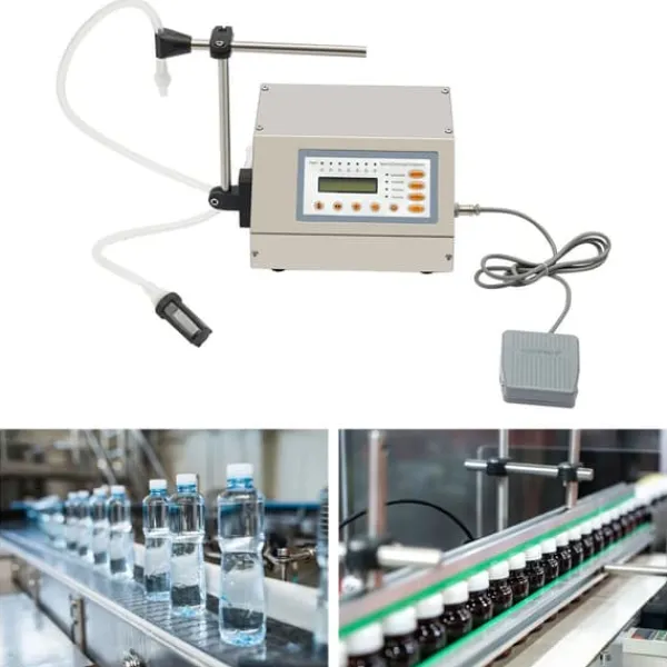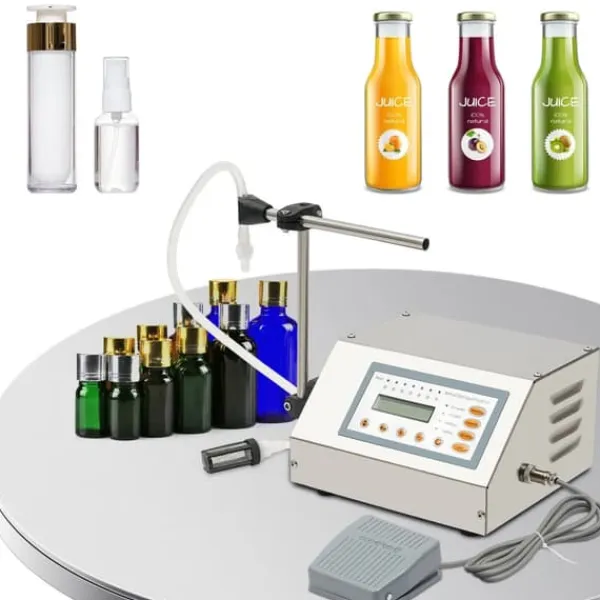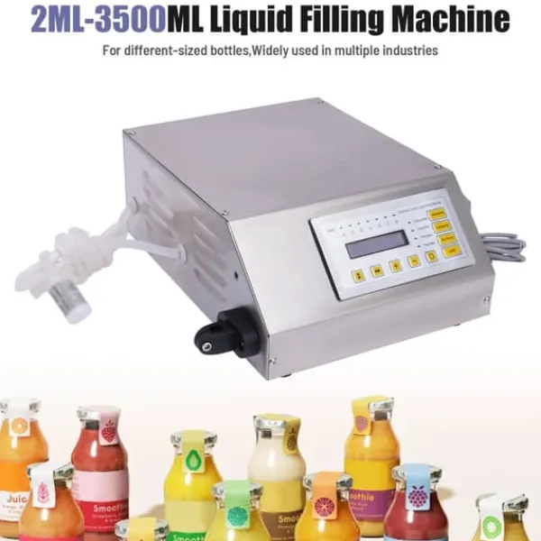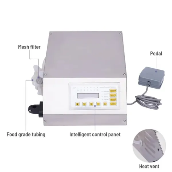 Præcis og brugervenlig: Denne fritstående væskepåfyldningsmaskine i sølv dækker 2–3500 ml med nøjagtig dosering, stærk 30 W ydeevne og enkel styring via fodkontakt.