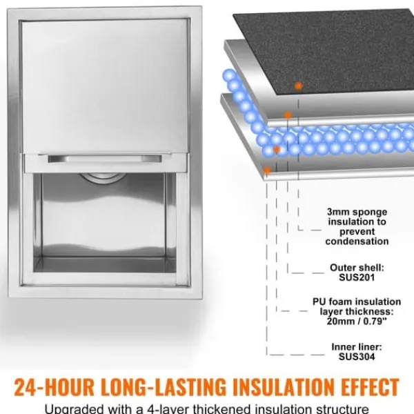 Iseffekt uden Elektricitet: Beholderen er fremstillet med en rustfri ståloverflade og en 0,79 tommer (20 mm) tyk PU-skumisolering. Den flytbare låg skaber et yderst isolerende rum, der holder indholdet koldt i over 24 timer uden behov for elektricitet eller energi.