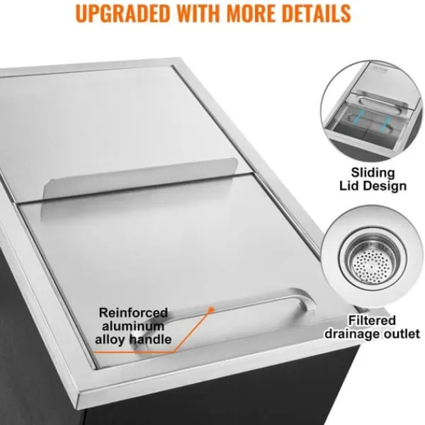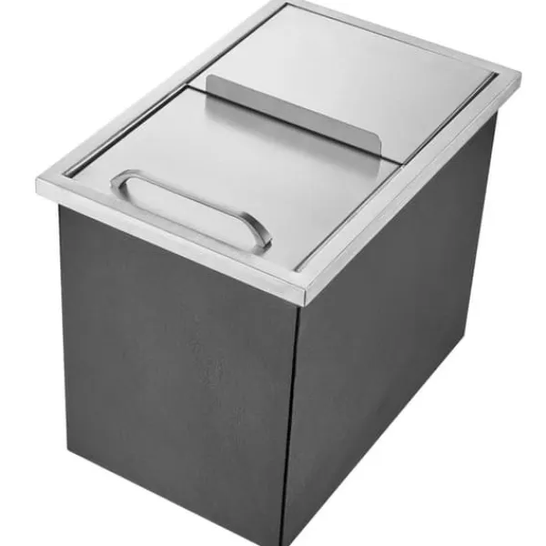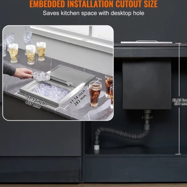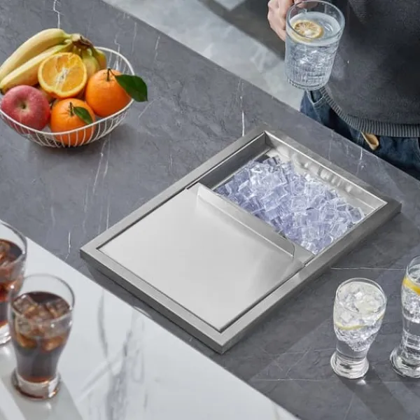 Indbygget Design: Isbeholderen kan integreres i barer, hoteller eller drikkevareafdelinger. Den er også velegnet til køkkenborde både indendørs og udendørs, hvilket sparer plads og giver en elegant løsning til isopbevaring.