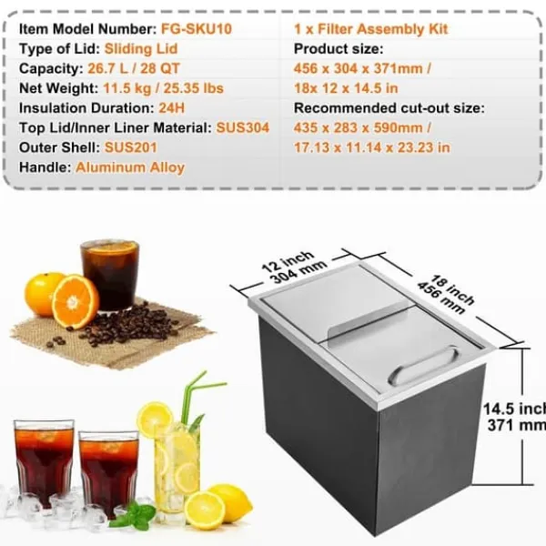 Stort Indhold: Denne drop-in isbeholder har et rummeligt design med plads til cirka 28 qt (26,7 L) is. Når den er fyldt, kan den servere op til 112 kopper 16 oz drikkevarer. Den er ideel til opbevaring af store mængder is eller til at køle forskellige drikkevarer.