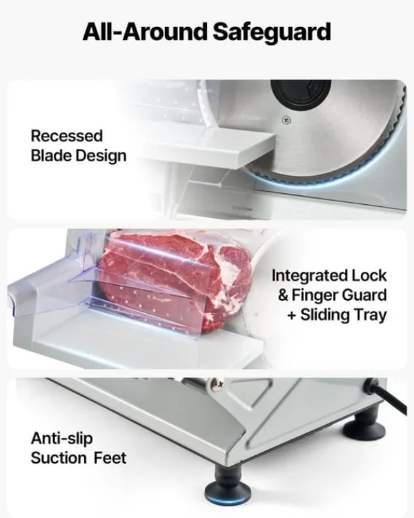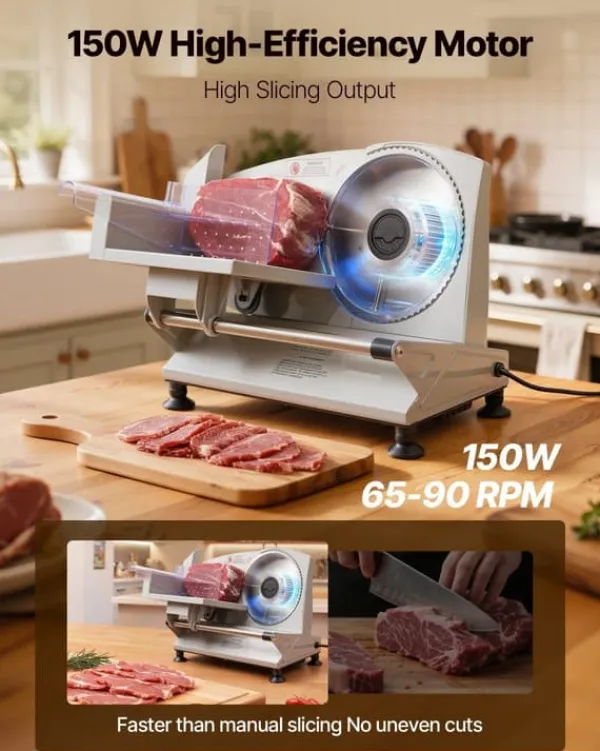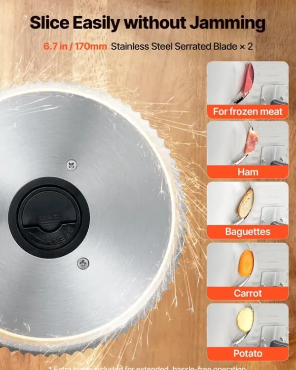 Den kraftige motor og de savtakkede 170 mm blade leverer stabile snit ved 65–90 omdr./min., så du får ensartede resultater i alt fra delikat pålæg til sejt kød. Kombinationen af effekt og bladkvalitet minimerer riv og fastklemning for et renere snit.