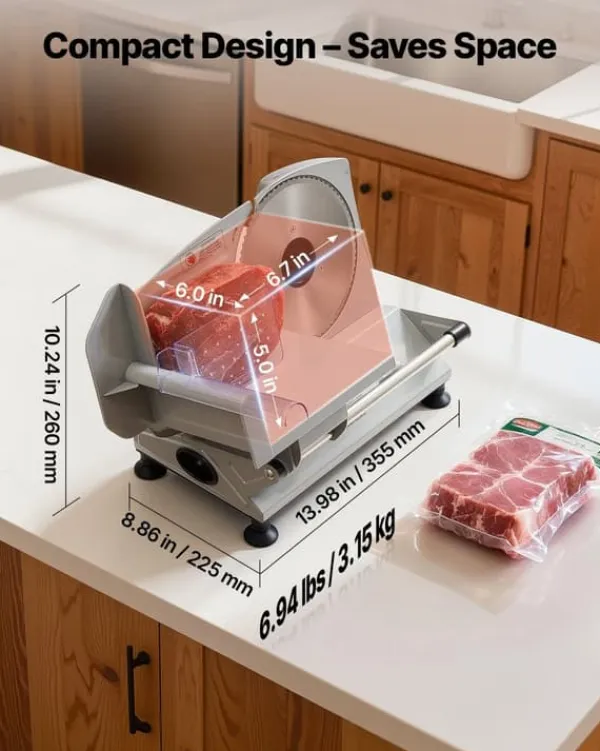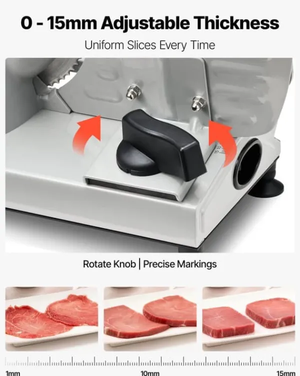 Alsidig elektrisk skæremaskine til præcise skiver i hjemmet – kraftig 150 W motor og dobbelte savtakkede 170 mm rustfri stålblade giver jævne, glatte snit uden fastklemning. Juster skivetykkelsen fra ultratynd til 15 mm og skær alt fra pålæg og roastbeef til brød, grøntsager og frugt. Kompakt, let og sammenklappelig for nem opbevaring.