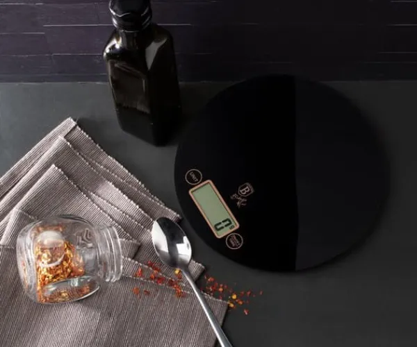 Super flad BERLINGER HAUS køkkenvægt. Praktisk og æstetisk i farverne i Black Rose-linjen, lavet af hærdet glas. Vægtens følsomhed er 1g og den maksimale vægt er 5kg. Indikationerne vises på et stort LCD-display med flydende krystal. Den har en meget praktisk automatisk nulstillingsfunktion og en TARE-funktion. Det betyder, at ingredienser kan kommes i en skål og vejes lidt ad gangen uden at fjerne de tidligere ingredienser, der er der. Denne model er æstetisk lavet af materialer af høj kvalitet. Vægten kan bruges med eller uden ethvert kar. Farverne matcher Black Rose-servicelinjen. Funktioner: Maksimal belastning: 5000g Vægtfølsomhed: 1g LCD-skærm Auto-nulstillingsfunktion Auto-sluk Tara-funktion Batteridrevet 2 x AAA Vejeenheder: g / lb / oz / kg Materiale: glas og ABS plast Farve: sort/guld Vægtmål: ⌀19 cm x 2 cm