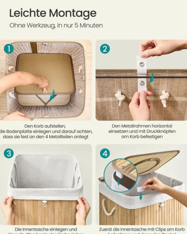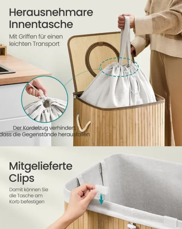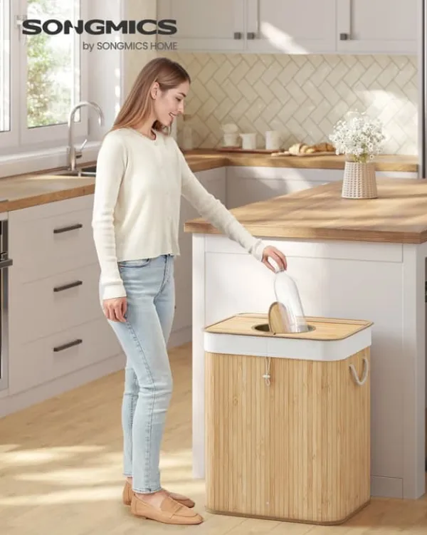 Denne genbrugsbeholder er designet til effektivt at samle tomme pantflasker, og kombinerer naturlig bambusæstetik med praktiske funktioner for bekvem brug i køkkener eller andre rum. Den inkluderer låg, indvendig pose med håndtag og ventilationshuller for at holde indholdet frisk og nemt at transportere.