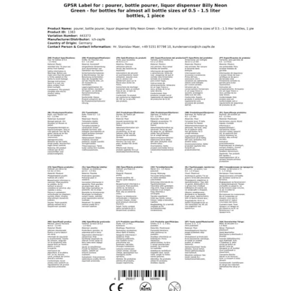 Skænkeprop, Hældetud Billy Neon Grøn til flasker til næsten alle flaskestørrelser fra 0,5 – 1,5 liter, 1 stk Billy Neon Green Pourer gør skænkning af drinks til en enkel og sjov oplevelse. Den fleksible skænker tilpasser sig perfekt til flaskeformater fra 0,5 til 1,5 liter og er derfor ideel til professionel brug i cateringsektoren såvel som til private lejligheder som fester og grill. Nu kan du skabe en professionel barstemning i dit hjem med disse produkter. Billy Neon Green tuden er ikke kun praktisk, men også meget elegant. Fordelene ved Billy Neon Green hældetud i detaljer •Tilpasning til forskellige flaskestørrelser:Hælderen passer til næsten alle standard flaskestørrelser fra 0,5 til 1,5 liter, hvilket muliggør universel anvendelse. •Nem at bruge:Takket være dets intuitive design er skænkeren nem at fastgøre til enhver flaske, hvilket gør det nemt at måle drikkevarer. •Effektiv lækagebeskyttelse:Takket være dets innovative design forhindrer skænkeren pålideligt utilsigtet spild af drikkevarer, hvilket sikrer renhed og effektivitet. •Fleksibel og præcis:Den fleksible hældetud giver dig mulighed for at hælde hurtigt og rent og præcist kontrollere mængden. •Lys neongrøn:Den iøjnefaldende farve på munden giver ikke kun et stilpræg, men gør det også nemt at finde hurtigt, selv i travle miljøer. •Robust og holdbar:Den er lavet af materiale af høj kvalitet, og skænkeren garanterer en lang levetid og er ekstremt holdbar selv ved intensiv brug. •Unik kombination af stil og funktionalitet:Billy Neon Green-skænkeren tilbyder ikke kun en effektiv løsning til at skænke drinks, men skaber også et visuelt højdepunkt. •Perfekt gave til enhver lejlighed:Denne skænker er et ideelt valg til enhver lejlighed. Giv dine venner, familie og kolleger denne praktiske og stilfulde gave. •Alsidig brug:Billy Neon Green-skænkeren er velegnet ikke kun til alkoholholdige drikkevarer, men også til vin, juice, sirupper og meget mere. •Nem at rengøre:Denne hældebeholder kan let rengøres under rindende vand og er derfor klar til brug når som helst. •Oplev en unik barstemning:Med Billy Neon Green skænker kan du opleve en unik barstemning derhjemme. Lad dig inspirere af dette elegante og praktiske produkt. Billy Neon Green skænker er et innovativt og praktisk værktøj, der giver dig mulighed for at skænke drinks på en enkel og sjov måde. Med sin lyse neongrønne og robuste konstruktion vil skænkeren tiltrække opmærksomhed ved enhver fest eller begivenhed.Leder du efter en enkel og praktisk løsning til at skænke drinks? Så bestil Billy Neon Green hældetuden nu og opdag fordelene ved dette unikke produkt!