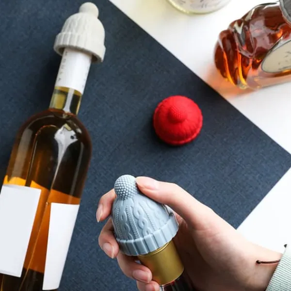 1, Stickad mössaform: Vinspararen formad som en utsmyckad stickad mössa med en pom pom för att ge flaskan en varm och mysig söt look, de blir snygga i kylen eller på en hylla.