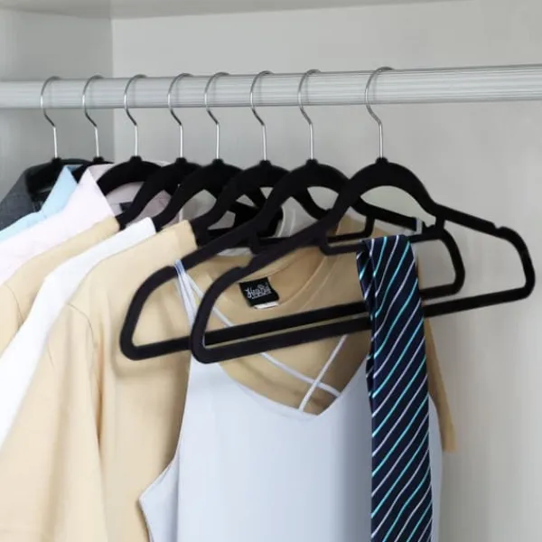Pladsbesparende design: Tykkelsen på dragtbøjlen er 0,6 cm, men er robust, så bøjlen optager lidt plads i garderoben og samtidig ikke går let i stykker