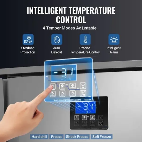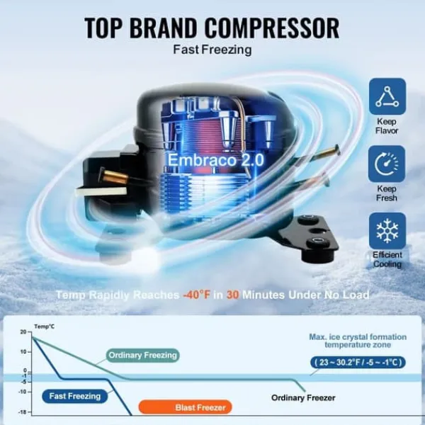 Denne hurtigfryser med topmærkekompressor fremskynder kold luftcirkulationen for hurtig frysning. Den er ideel til eksklusive fiskerestauranter, vestlige spisesteder, centrale køkkener og meget mere, med dens rummelige kapacitet på 114 L / 4 Cu.ft.